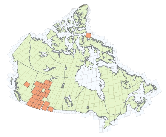 The orange tiles represent areas covered by the U of C Landsat collection. Contact the MADGIC desk to obtain copies of the data.